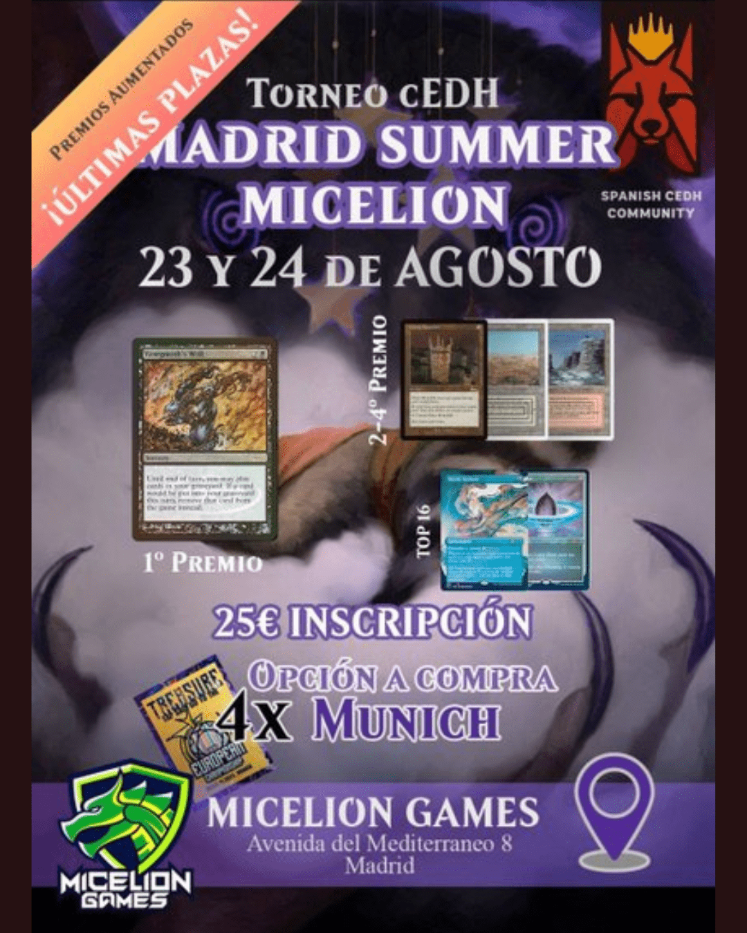 Torneo Cedh invitacional en Madrid. Tipo de Formato: cEDH (Competitive Elder Dragon Highlander). Formato de Torneo: Formato de torneo suizo utilizando la aplicación de topdeckgg. Fecha: Sábado 23 de agosto de 2025 Hora: 10:00 Lugar: Micelion Games Av. del Mediterráneo, 8, Retiro, 28007 Madrid, Spain