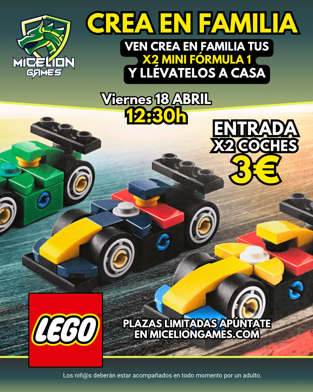 Los niñ@s siempre tendrán que estar acompañados por un adulto, los acompañantes adultos que no quieran crear el mini coche de Fórmula 1 no tienen que pagar entrada. Para control de aforo, por favor escribidnos al Whatsapp o llamadnos por teléfono al 624721978 e informadnos del número de acompañantes que vendrán con el/la/los niñ@s .
