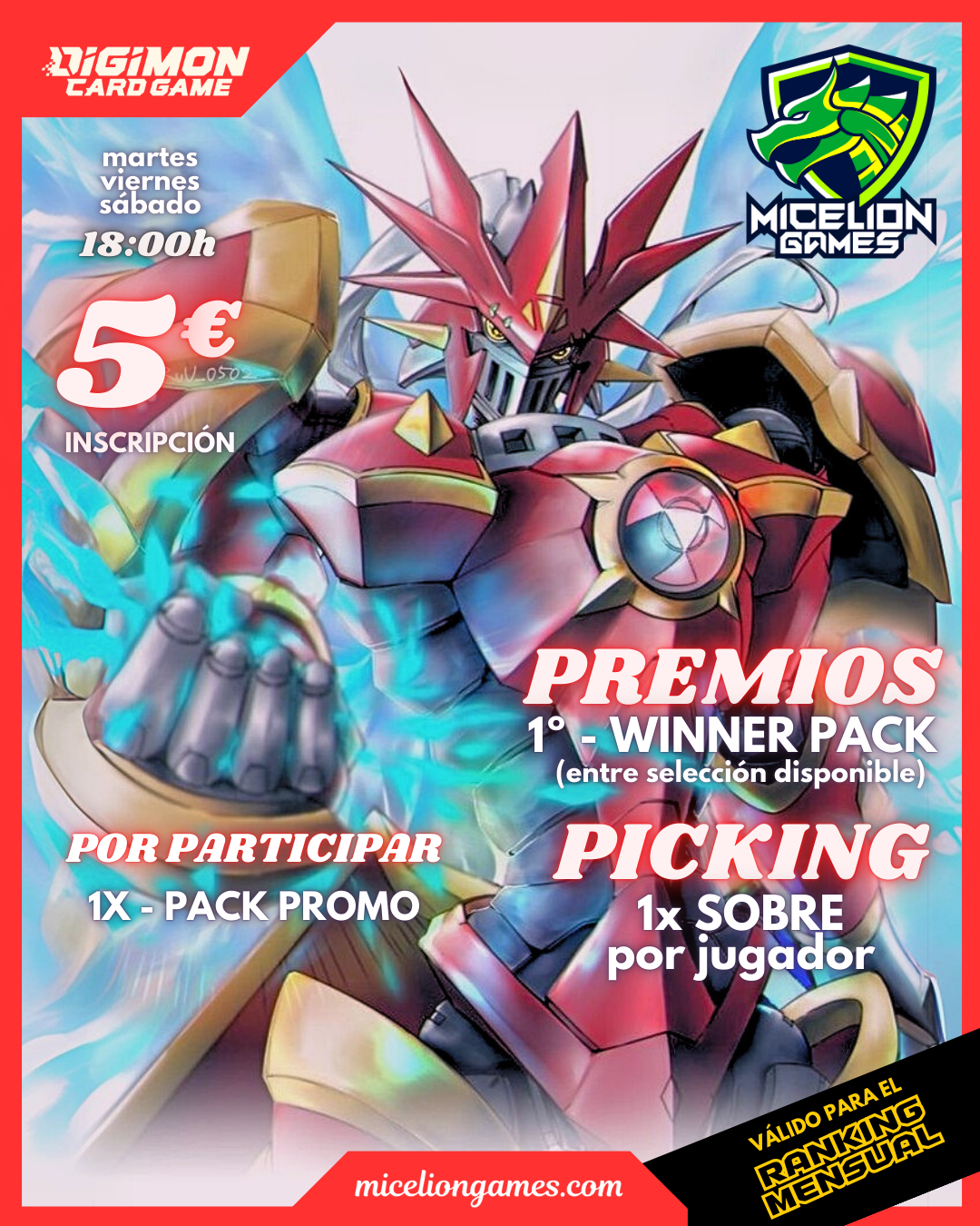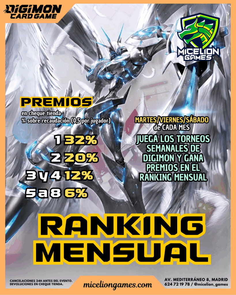 Los torneos semanales de 5€ (no especiales) puntúan para el Ranking Mensual de Digimon de Micelion Games.