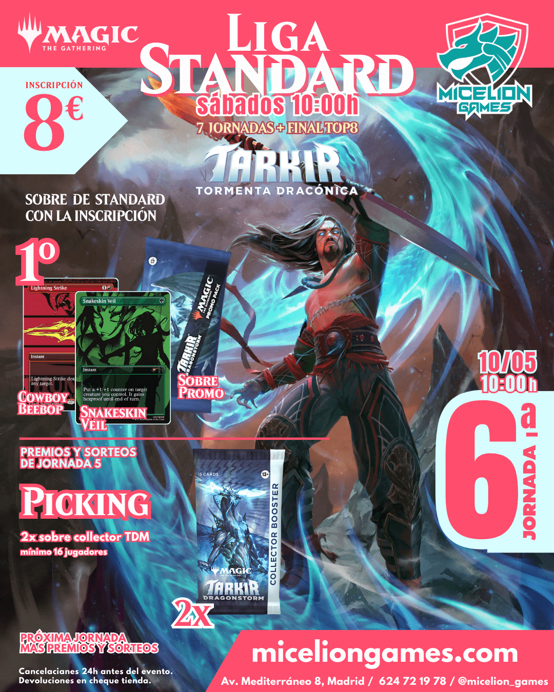 4. La inscripción de cada jornada será de 8 euros, excepto la Final TOP 8 en la que los clasificados no tendran que abonar la inscripción. Se incluye un sobre de Tarkir Dragonstorm con la inscripción. Se acumula 1 sobre de Tarkir Dragonstorm cada 2 jugadores por cada jornada para los premios de la final.