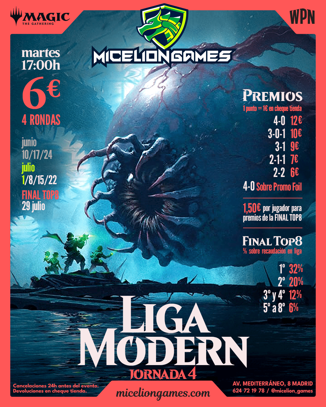 2. Las Jornadas de la liga se celebrarán los martes a las 17:00h. Rogamos puntualidad para poder empezar cuanto antes. Si te inscribes con antelación en nuestra web, miceliongames.com, mejor. Se disputarán 4 rondas por jornada. Las fechas de las jornadas y la final del TOP8 serán: