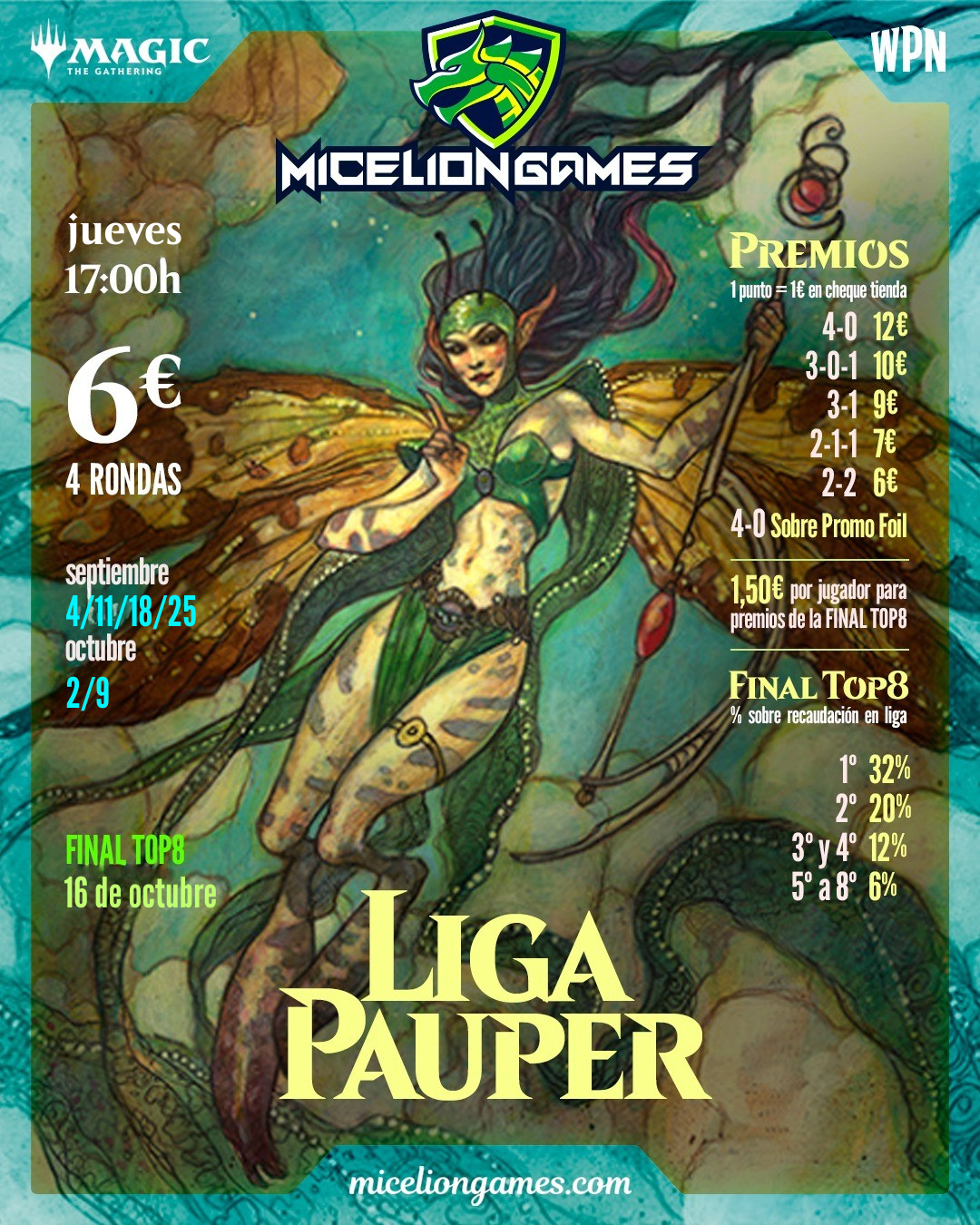 2. Las Jornadas de la liga se celebrarán los jueves a las 17:00h. Rogamos puntualidad para poder empezar cuanto antes. Si te inscribes con antelación en nuestra web, miceliongames.com, mejor. Se disputarán 4 rondas por jornada. Las fechas de las jornadas y la final del TOP8 serán: