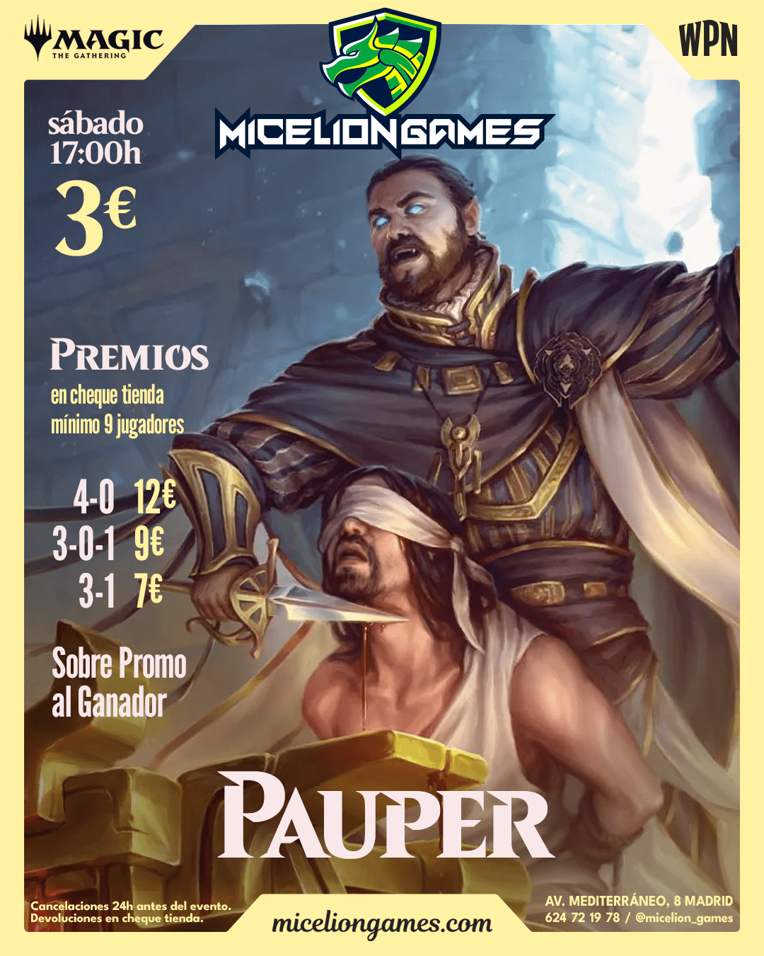 Volver a la TiendaSábado · 17:00h · 3€ · Formato Pauper · Las inscripciones estarán abiertas hasta 15 minutos antes del torneo.