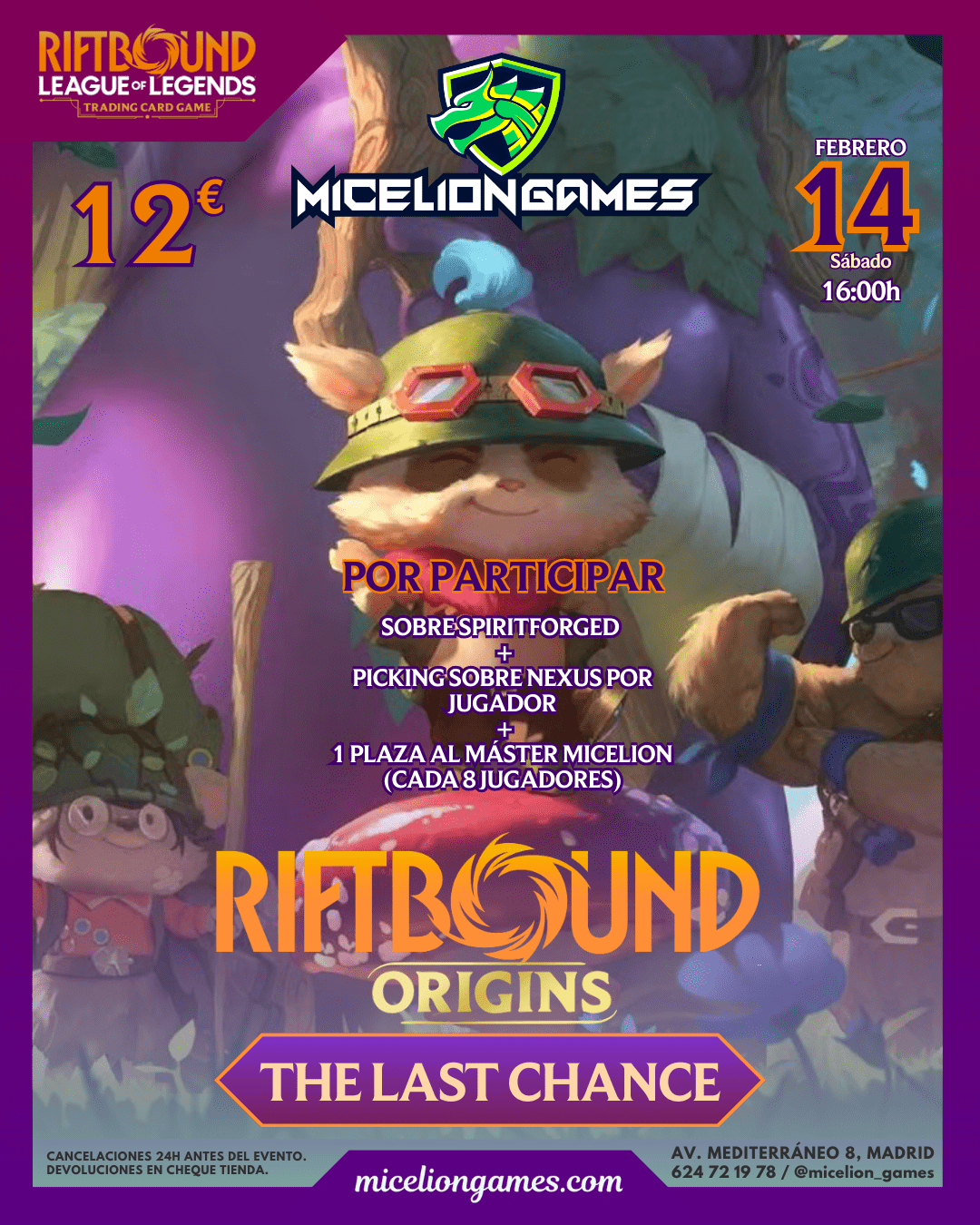 Volver a la TiendaSábado 14 · 16:00h · 12€ · Las inscripciones estarán abiertas hasta 15 minutos antes del torneo.