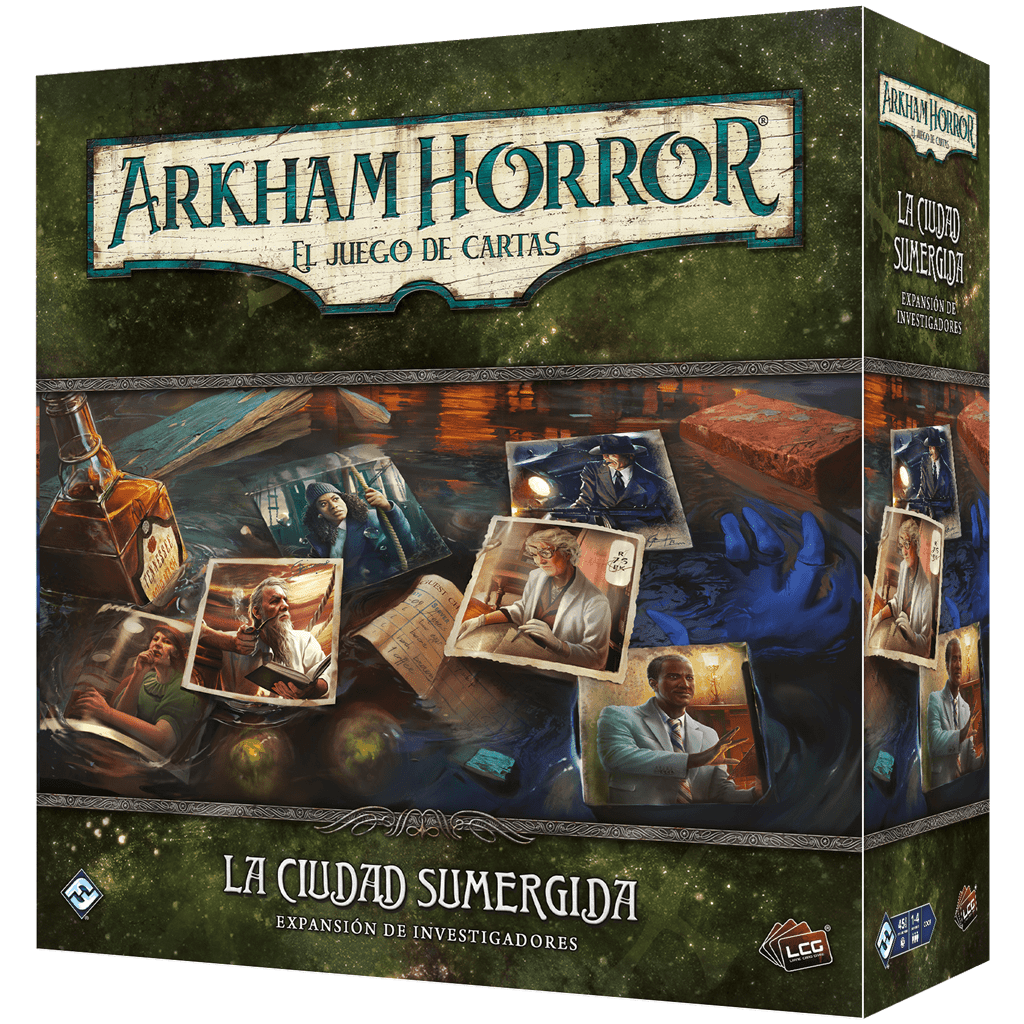 La expansión de investigadores La ciudad sumergida presenta 6 investigadores nuevos y multitud de nuevas cartas de Jugador y opciones para el juego, incluidas nuevas cartas Especialista que aprovechan los rasgos de los investigadores. Protege a los vulnerables como Mario Tavares, la pescadora de arrastre; saca inspiración de los horrores como Lucius Galloway, el poeta; mantén los monstruos a raya con una lluvia de balas como Michael McGlen, el gánster; difumina la frontera entre ciencia y misticismo como Agatha Crane, la parapsicóloga; controla tu destino con visiones proféticas como Gloria Goldberg, la escritora; y prepárate para capear cualquier tormenta como George Barnaby, el abogado.