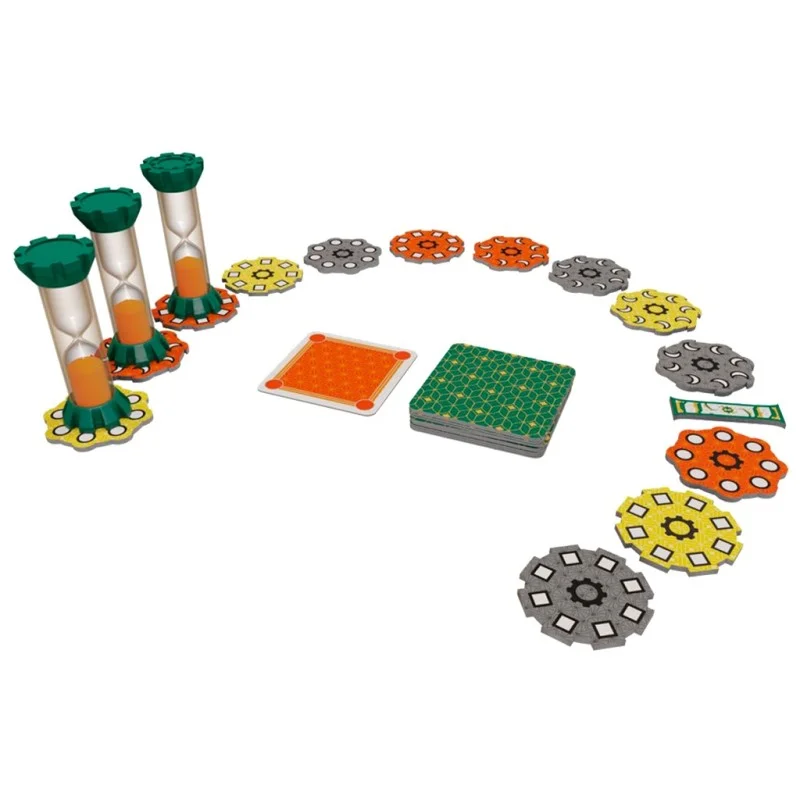 5 relojes de arena, 19 fichas de Engranaje, 55 cartas, 1 Desactivador y 3 marcadores de Bloqueo