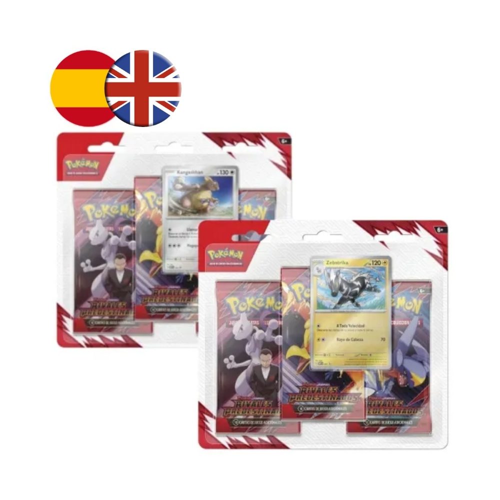 Sumérgete en la emoción del Juego de Cartas Coleccionables Pokémon con el Blíster de 3 sobres – Rivales Predestinados – Kangaskhan y Zebstrika. Este pack exclusivo incluye tres sobres de mejora de la expansión Escarlata y Púrpura – Rivales Predestinados, junto con dos cartas promocionales holográficas de Kangaskhan y Zebstrika.