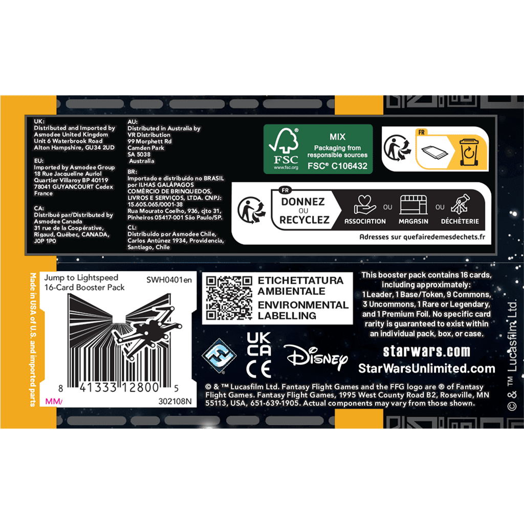 The Jump to Lightspeed set features characters and content from across multiple eras in the Star Wars galaxy, with a particular focus on epic space battles. Each booster pack can be used to build and upgrade decks for head-to-head, multiplayer, draft, or sealed play.