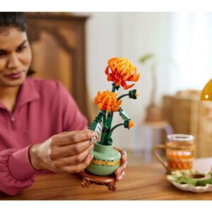 Construye un crisantemo vibrante con el set LEGO Botanical 10368. Este set de construcción para adultos incluye hojas y pétalos articulados, con flores naranjas en diferentes etapas de crecimiento: capullo, abriéndose y abiertas. La maceta verde pastel con una banda dorada y una peana que imita la madera añade un toque elegante a cualquier espacio. Perfecto para decorar el hogar o la oficina, este set ofrece una experiencia de construcción relajante y un adorno floral atemporal. Ideal como regalo para cualquier ocasión, el crisantemo LEGO es una pieza única que no necesita riego.