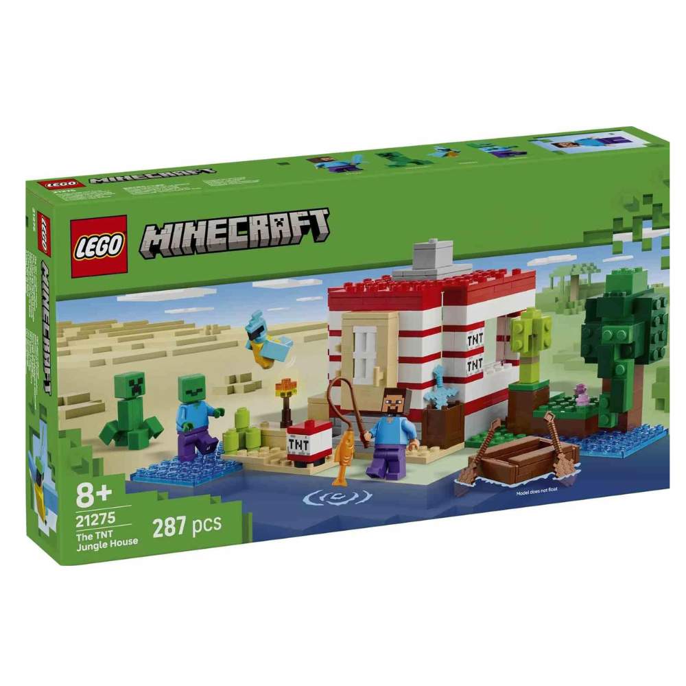 La casa construible se sitúa en el bioma Selva de Minecraft y parece una versión a gran escala de un icónico elemento del juego: la dinamita. Los niños accionan el interruptor del lateral para provocar una explosión de dinamita que derrumbe la casa. Cuando se asiente el polvo, podrán reconstruirla para la siguiente aventura. Las minifiguras de Steve, un Creeper™ y un zombi darán paso al juego imaginativo y a emocionantes batallas. También incluye accesorios LEGO Minecraft: un barco, una caña de pescar, un pez, un loro y vegetación de la selva. La app LEGO® Builder ofrece al peque la diversión añadida de usar su dispositivo para acercar y girar versiones 3D de sus modelos. Contiene 287 piezas.