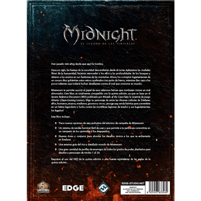 Embárcate en una épica lucha contra el mal con el libro de rol Midnight. Este sistema de juego te permite asumir el papel de valerosos héroes decididos a enfrentarse a un mal abrumador en el fascinante mundo de Eredane. Totalmente compatible con la quinta edición, se basa en la SRD publicada por Wizards of the Coast bajo la Licencia de Juego Abierto (Open Gaming License). Escoge tu personaje entre diversas culturas como elfos, humanos, enanos, medianos, gnomos y orcos, y forja tu propia senda heroica para convertirte en una leyenda mientras combates contra las legiones de Izrador y sus temibles lugartenientes.